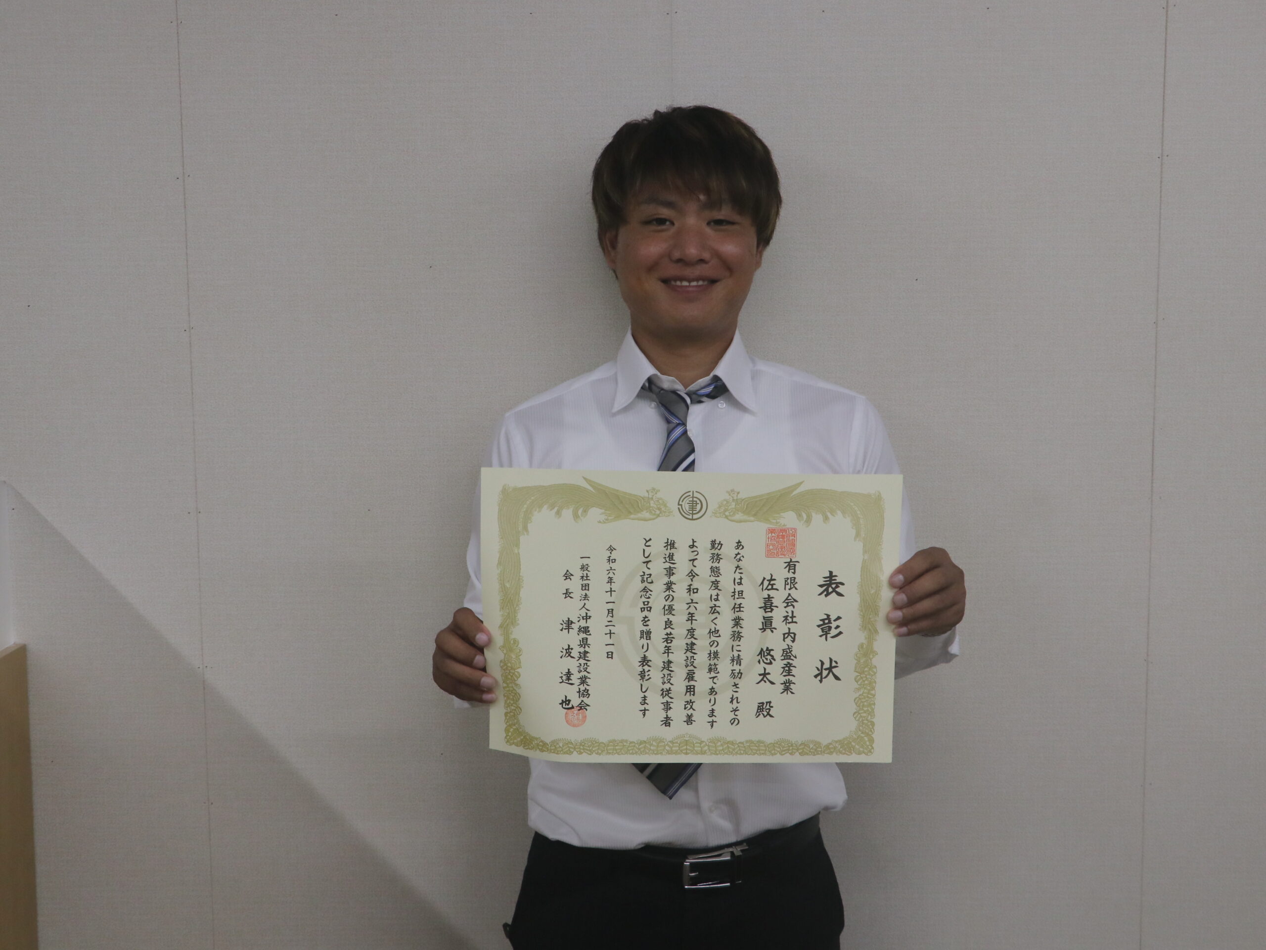 弊社からは、佐喜眞 悠太さんが「優良若年建設従事者表彰」を受賞いたしました。